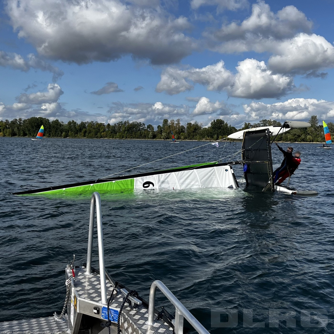 Beide Tage sicherte ein Bootstrupp mit unserem Motorrettungsboot "Hope" die Tümpel Trophy des RSCZ ab, an der rekordverdächtige 39(!) Hobie 14 bzw. Hobie 16 Katamarane teilnahmen. Mit vier Läufen am Samstag wurde die NRW Landesmeisterschaft und Ranglistenregatta bei Sonnenschein und gutem Wind durchgeführt. Neben kleineren Zwischenfällen, wie dem Aufrichten von gekenterten Katamaranen, leisteten unsere Sanitätshelfer mehrmals Hilfe und übernahmen die Patientenversorgung bis zum Eintreffen von Rettungsdienst und Notarzt. Sonntags war leider so wenig Wind, dass keine weiteren Wettfahrten stattfinden konnten und unsere Helfer:innen die Zeit spontan zur Ausbildung nutzen konnten.